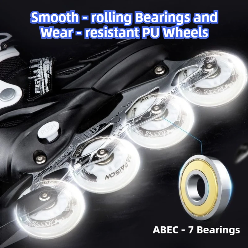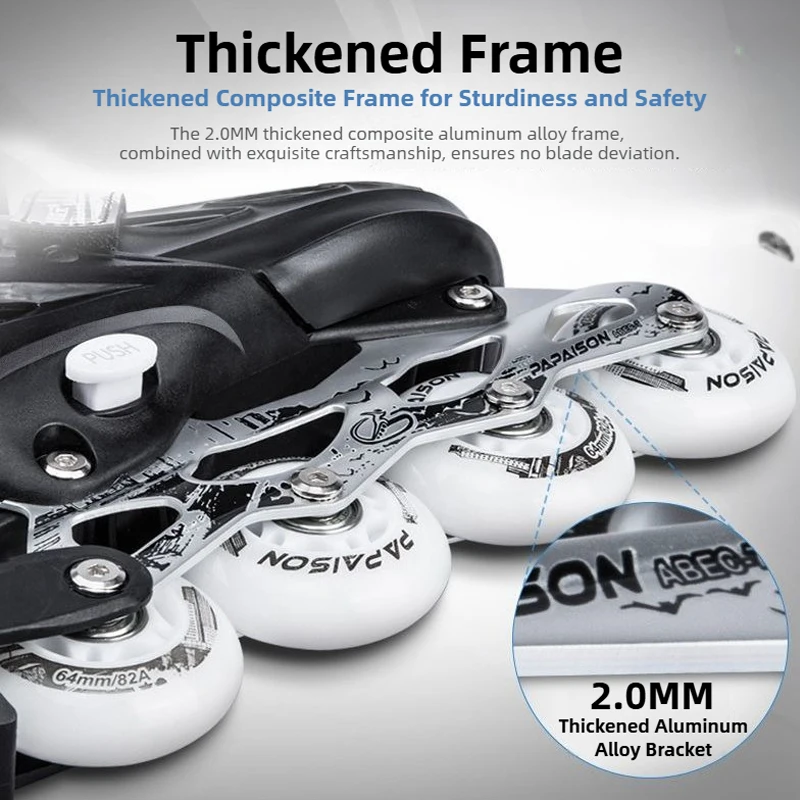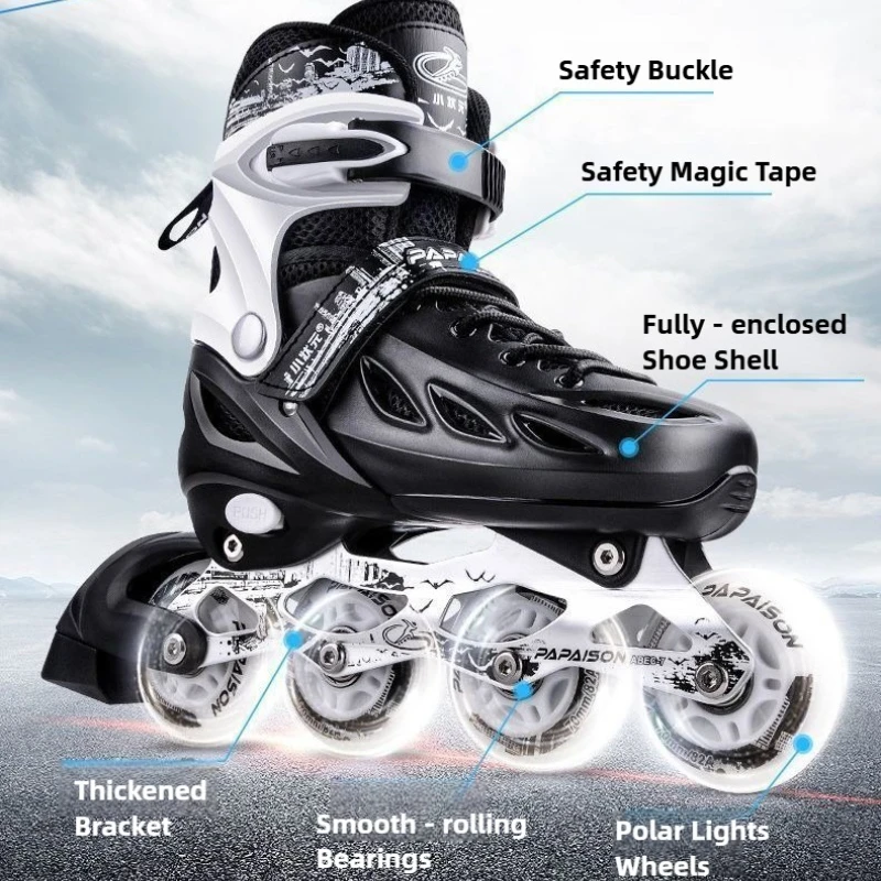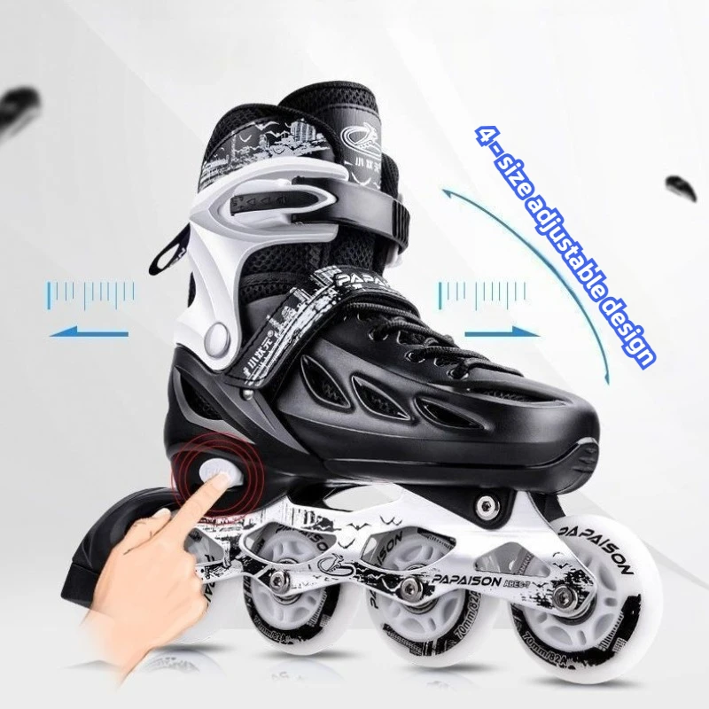 PAPAISON adjustable inline skates are designed for both adults and youth, suitable for men and women, making skating easier for the whole family to enjoy. With a reinforced PP impact protection shell, thickened aluminum alloy frame, high rebound rubber wheels and silent ABEC-7 bearings, this skate delivers safety, comfort and durability for street riding, fitness training, campus commuting and beginner freestyle practice. The 4-size adjustable system gives longer usage life and wider adaptability — perfect for growing teens as well as adult riders who want a stable and supportive setup.